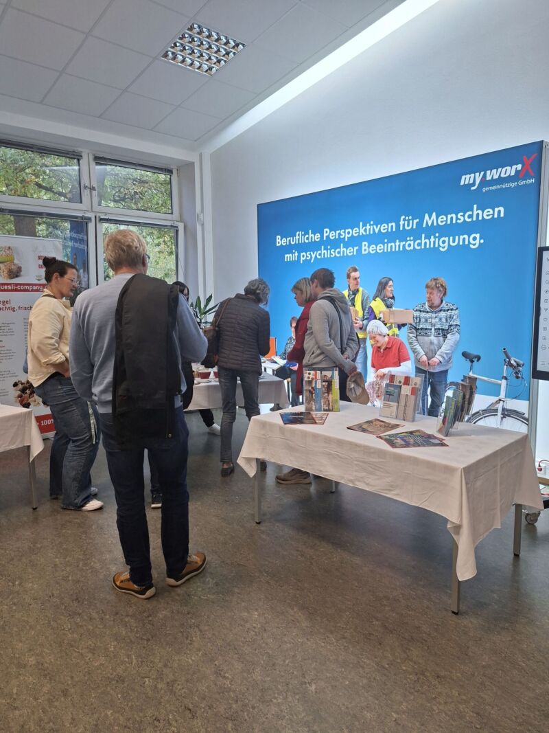 Die Veranstaltung bot Einblicke in die tägliche Arbeit und die vielfältigen Arbeitsangebote und Aktivitäten unserer Werkstatt. Von Upcycling-Produkten über LEGO®-, Müsli-, Fahrrad- und Buch-Shops bis hin zur leckeren süß-und-herzhaft-Verköstigung durch das Catering-Team war es wieder ein abwechslungsreicher gemeinsamer Nachmittag miteinander. In den persönlichen Gesprächen mit Fachkräften und Sozialdienst konnten offene Fragen geklärt und individuelle Anliegen vorgebracht werden.